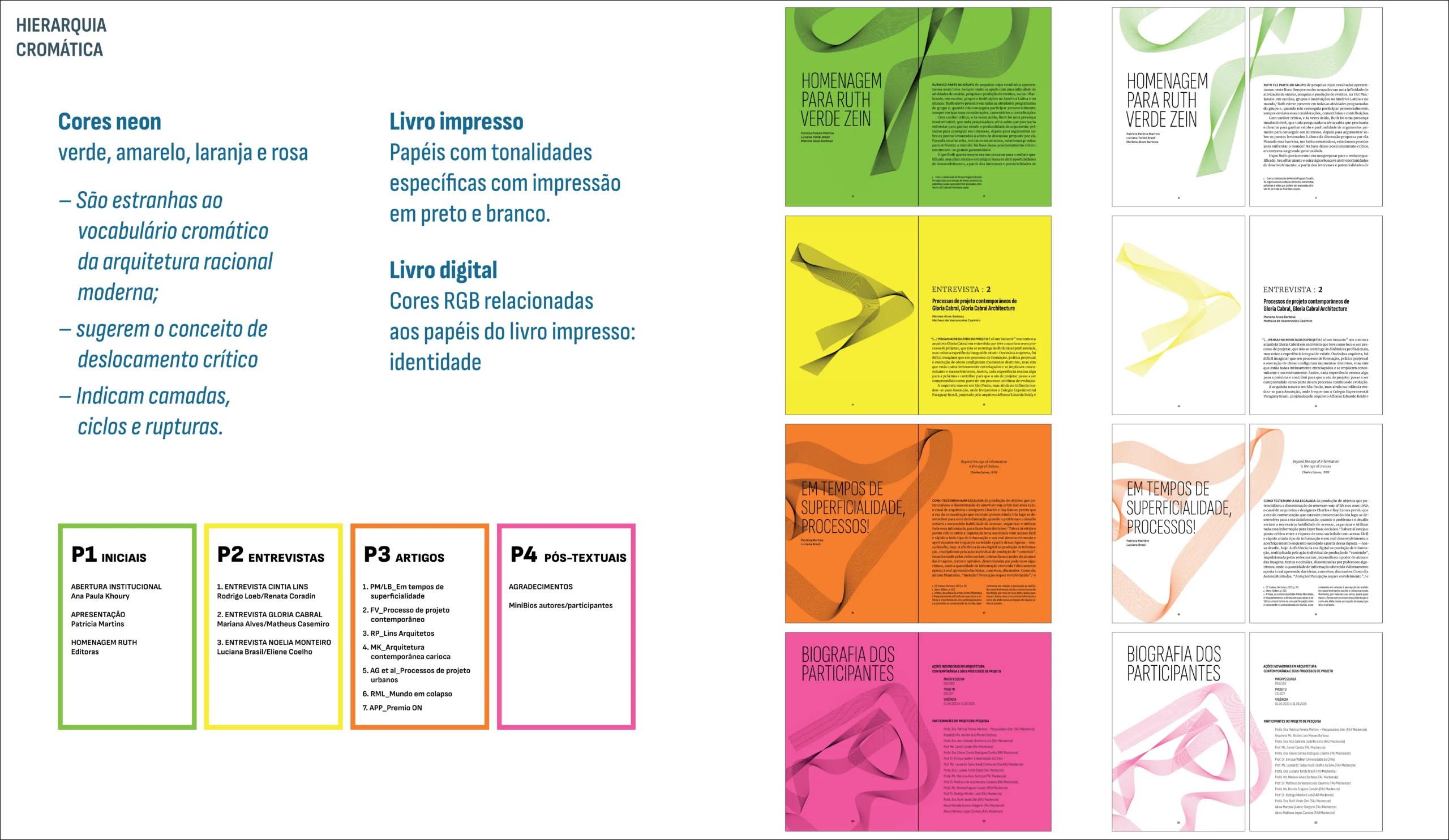 O formato pequeno é uma escolha deliberada – desloca o valor dado à escala como dispositivo de poder. A tipografia generativa da capa e elementos gráficos, construída por algoritmo, traduz a ideia central: o projeto como fluxo, não como estado fixo. Quatro cores neon hierarquizam as seções – no impresso, sobre papéis tonalizados; no digital, em RGB. Estranhas ao vocabulário sóbrio da arquitetura moderna, sinalizam deslocamento crítico: as camadas e rupturas que o livro investiga também estão na sua forma.